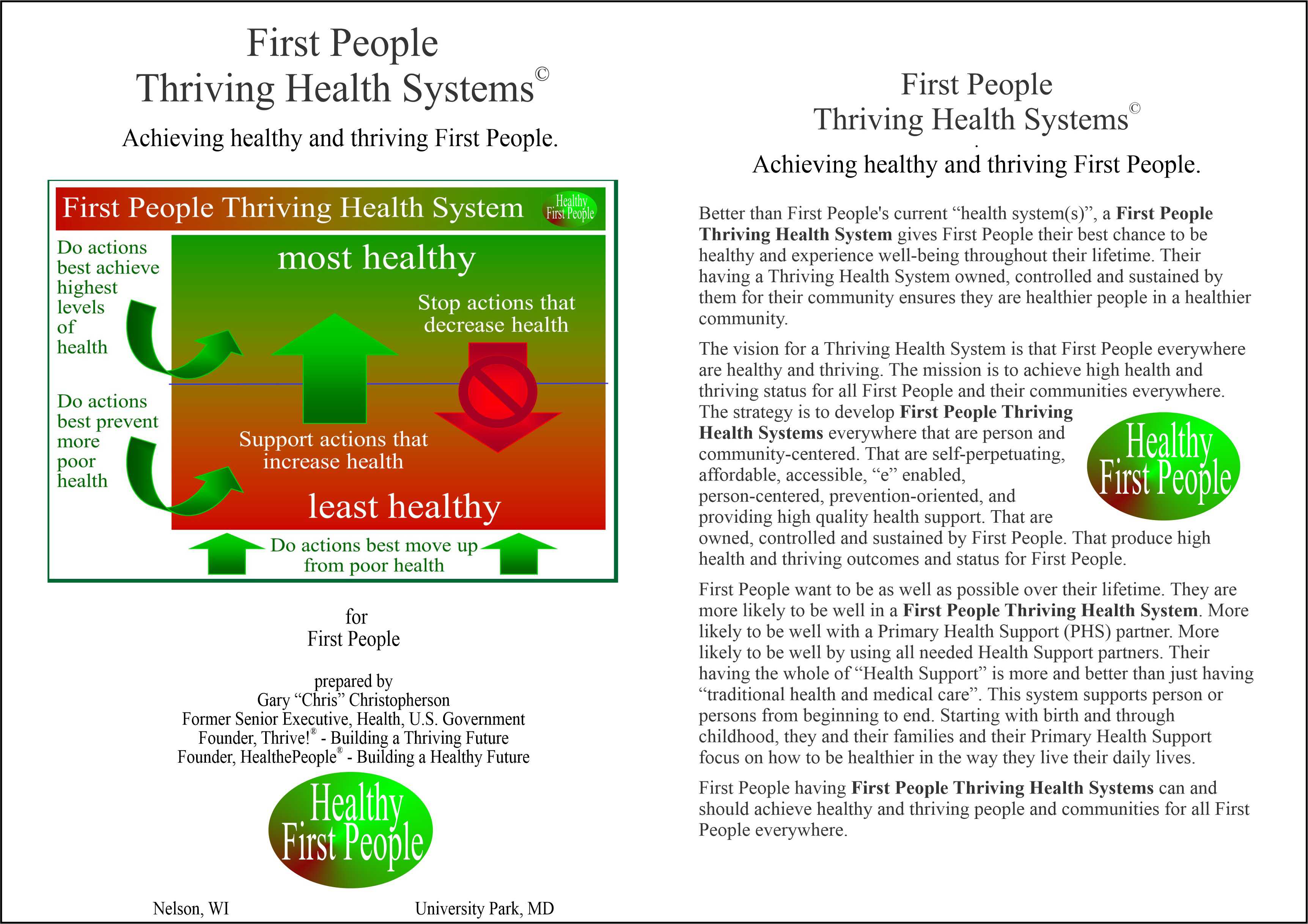 This is the HealthePeople® vision for First People Thriving Health Systems and the communities they support. As people, and communities, we First People should proceed toward the vision of achieving healthy and thriving First People and communities everywhere. We do this via a strategy of First People Thriving Health Systems for all First People everywhere. Thriving Health Systems are self-perpetuating, very affordable, easily accessible, “e” enabled, person-centered, prevention-oriented, high quality and are producing high health and well-being outcomes and status. Such Thriving Health Systems, partly physical and partly virtual and put into place by collaborative private and public partnerships, will greatly improve accessibility, quality and affordability for all First People everywhere. We First People can and should build and sustain First People Thriving Health Systems for all people everywhere. We can and should achieve substantially healthier First People and communities and move toward a truly healthy and thriving First People. All First People everywhere deserve and should expect nothing less.